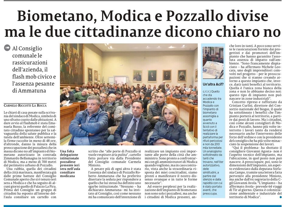 Abbiamo seguito con grande attenzione il Consiglio comunale di Modica e facciamo i complimenti a tutta la cittadinanza per la grande prova di democrazia. Complimenti anche ai cittadini di Pozzallo che in sole 24 ore sono riusciti a raccogliere quasi 8000 firme, continueremo ad assere vigili sulla questione. – La Sicilia