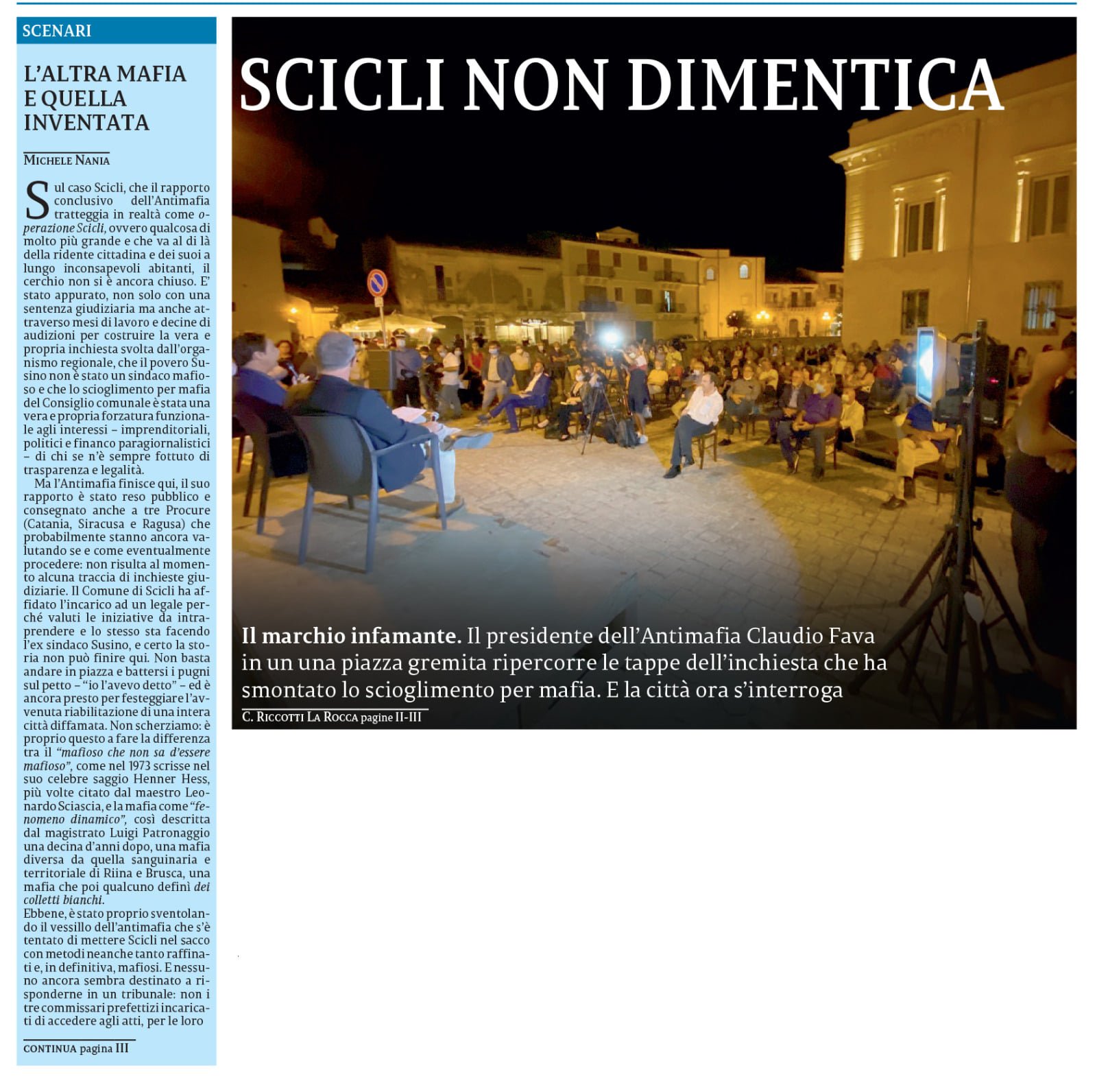 La Sicilia dedica ampio spazio alla vicenda dello scioglimento per mafia del Comune di Scicli. Una vicenda per la quale vengono ancora cercati i mandanti e che ha tentato di infangare una città intera ed i suoi abitanti pg. 1