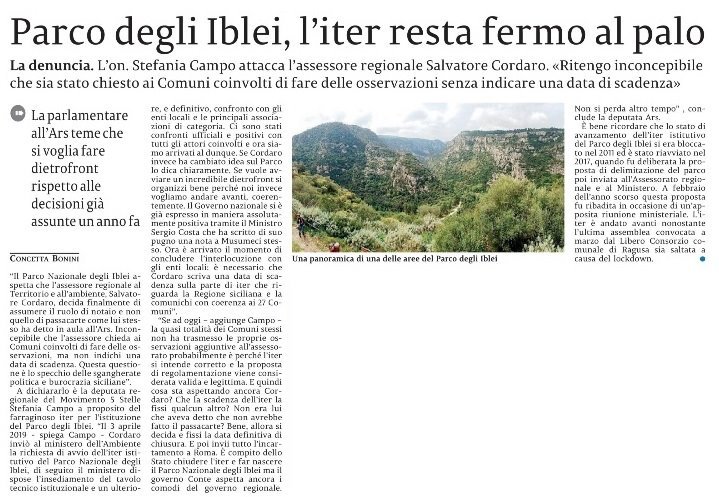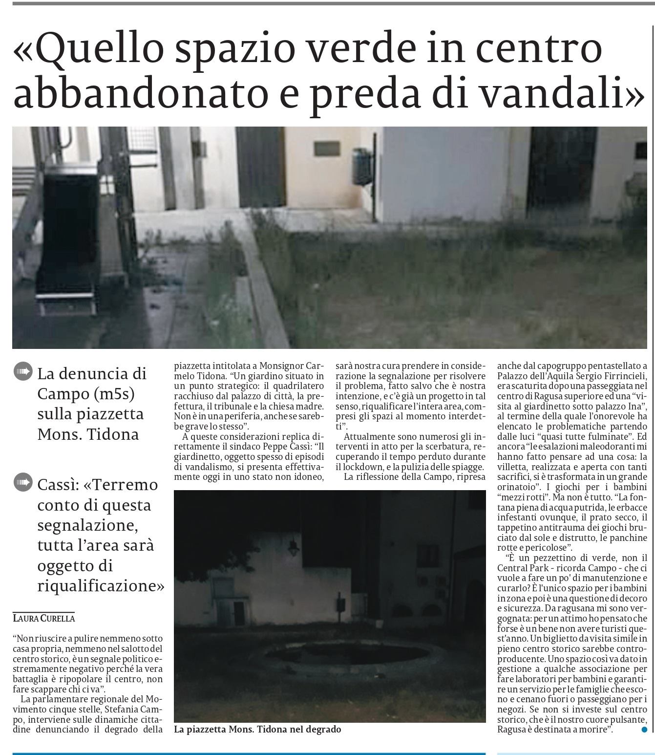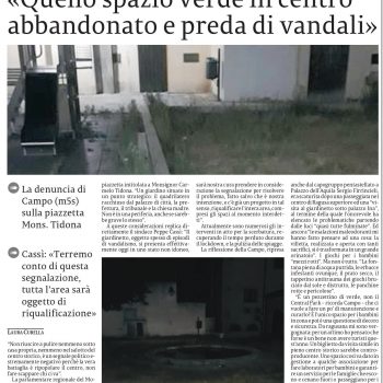 Siamo contenti che la nostra segnalazione della piazzetta intitolata a monsignor Carmelo Tidona sia stata presa in considerazione dall’amministrazione comunale. Che ben vengano i progetti futuri ma in attesa auspichiamo una pronta manutenzione che restituisca alle famiglie e soprattutto ai bambini il giardinetto del centro storico.